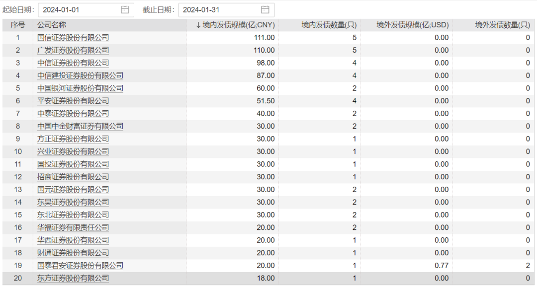 从已发债规模来看,截至1月31日,发行成功金额最多的5家券商为国信证券、广发证券、中信证券、中信建投、中国银河,金额均在60亿元以上。其中,国信证券已发债规模最高,总额合计111亿元。居第二位的为广发证券,总额合计110亿元。