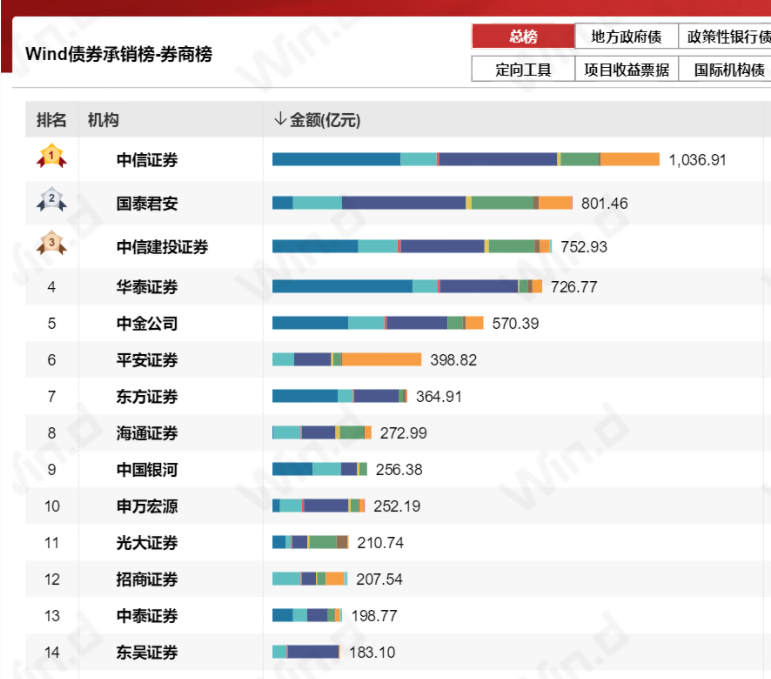具体来看,“券商一哥”中信证券以1036.91亿元的承销金额位列榜首;另有国泰君安、中信建投分别以801.46亿元及752.93亿元分别居总承销榜第二、第三位。另外,华泰证券、中金公司、平安证券、东方证券等4家券商债券承销金额达300亿元以上,分别为726.77亿元、570.39亿元、398.82亿元和364.91亿元,位列第四至第七位。