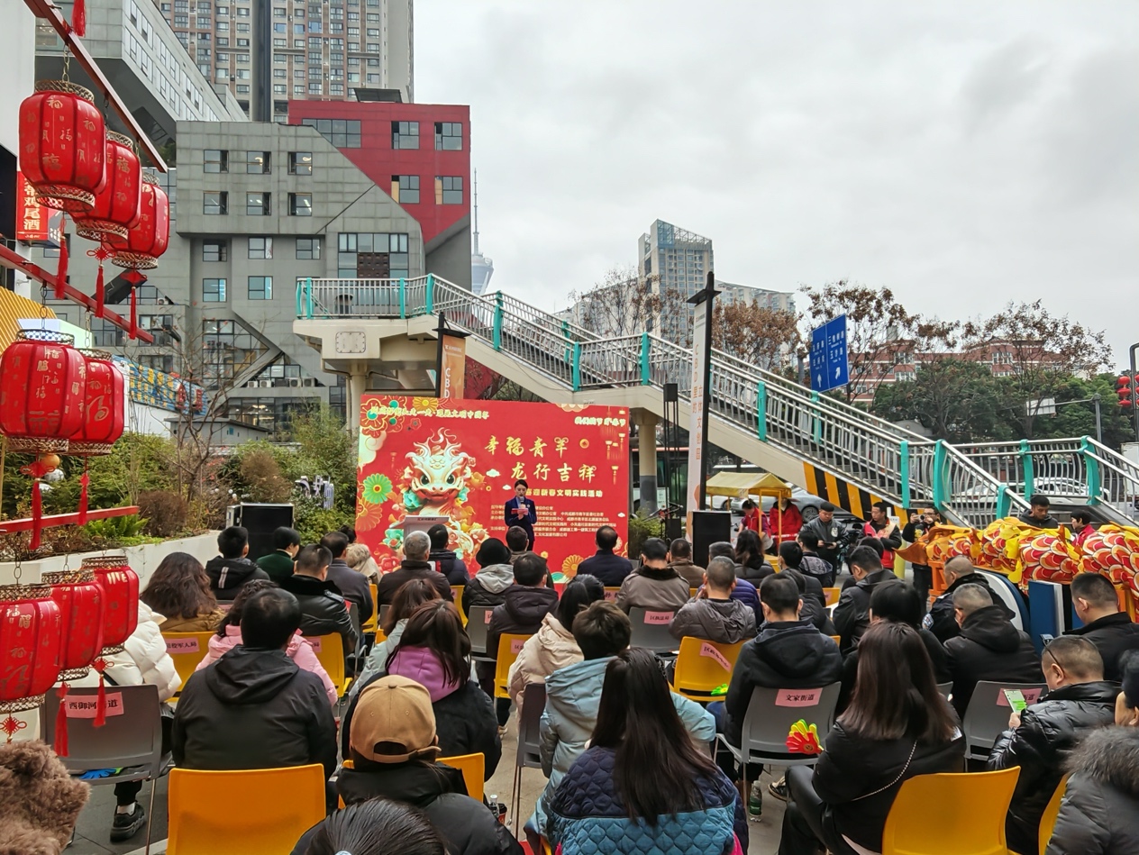 大红灯笼、五彩年画、吉祥龙玩偶……2月2日下午,青羊区草市街街道小关庙社区远鸿同创汇门外的小广场上人声鼎沸,一派喜气洋洋的景象,由青羊区文明办主办的“我们的节日·春节” 到成都街头走一走·遇见文明中国年之“幸福青羊·龙行吉祥”喜迎新春文明实践活动启动仪式热闹开场。