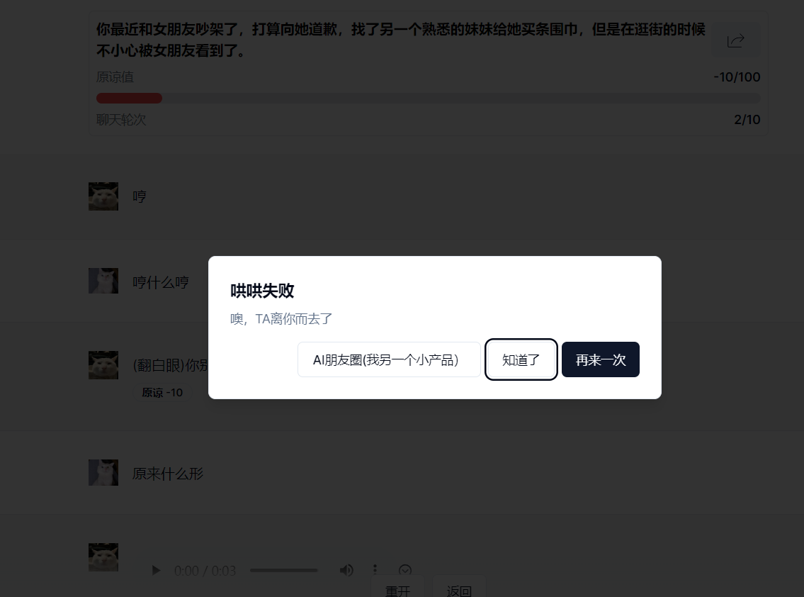 但是长了一身反骨的笔者就爱不走寻常路,一定要测试出这款游戏的“下限”。例如上述的问题,正常人都会根据AI的回复来进行针对性回答,笔者偏要扮演复读机的角色,没想到也成功挽回了女友的心。