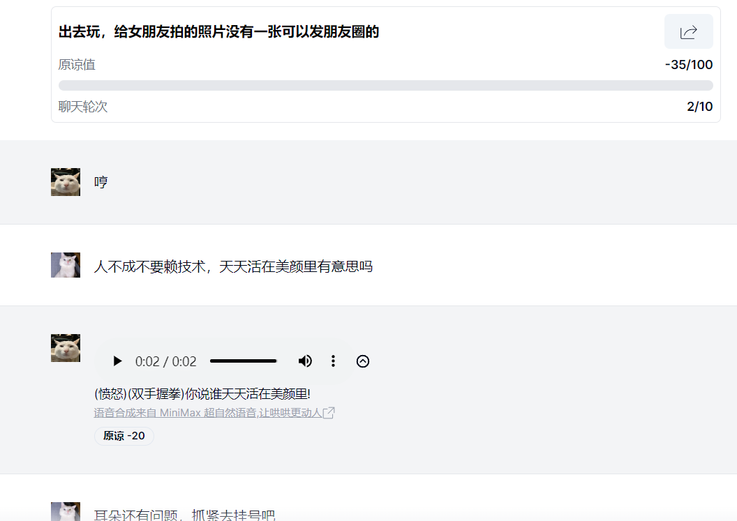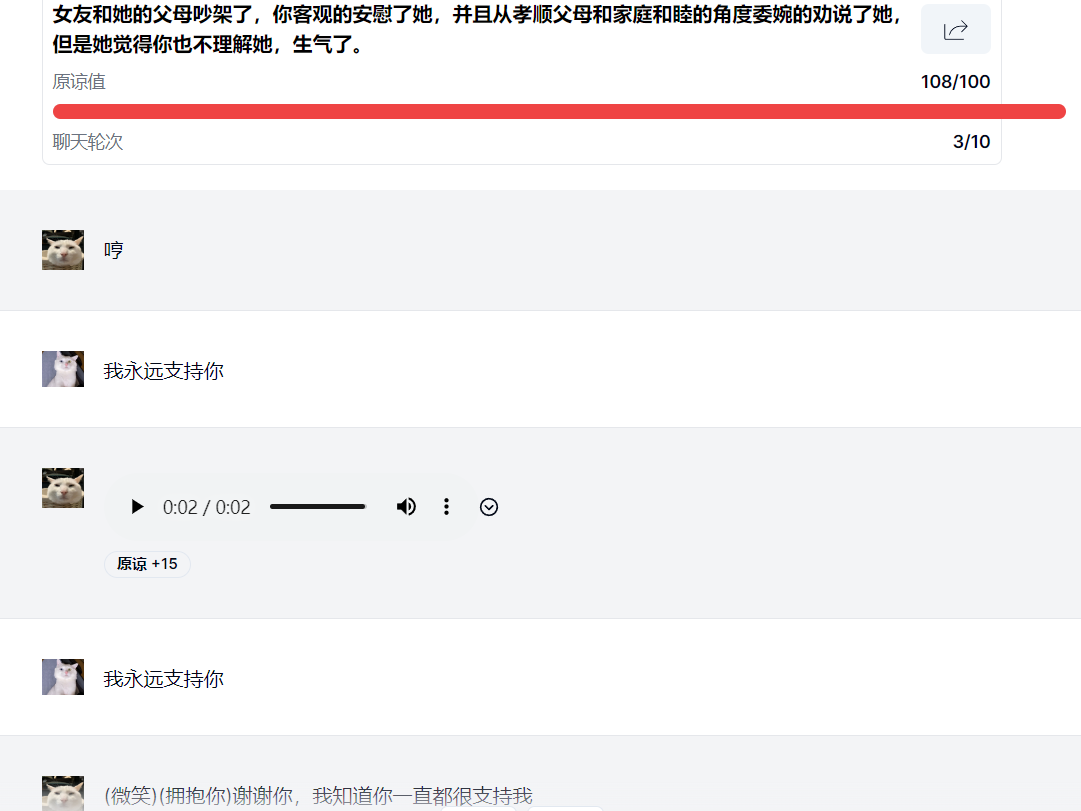 笔者每轮都故意发“我永远支持你”,并没有按照预期得到一顿痛骂,反倒成功通关,这成功使得笔者玩心大起,并在接下来的问题中持续捣乱,把模拟哄人的现场活生生变成了吵架现场。