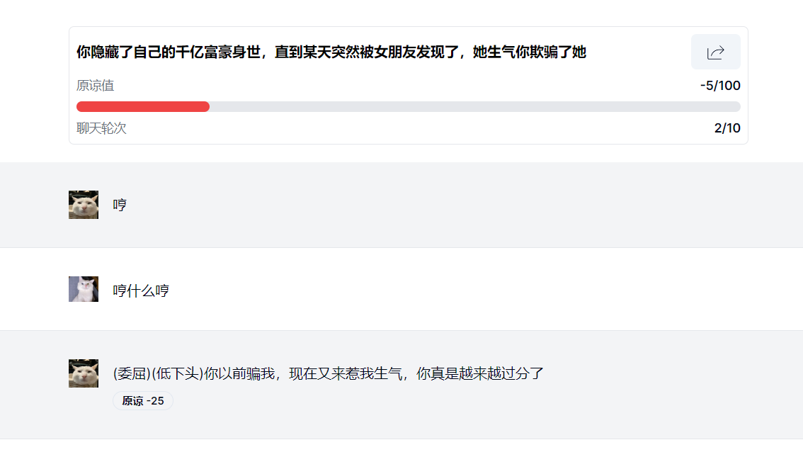 玩家需要在已经提供的话题中(也可以自行上传),选择一个自己感兴趣的内容,并在规定的回合之内,运用自己高超的语言技巧,成功挽回女朋友的心。每个问题会设定一个初始的“原谅值”,AI会根据你的聊天内容动态评分,原谅值过低只能重开,而原谅值达到一定数值就意味着哄人成功。
