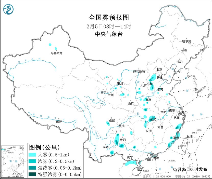 预计,5日早晨至上午,雷州半岛沿岸海域、粤西沿岸海域、北部湾偏北海域、福建沿岸的部分海域将有大雾,能见度不足1公里。此外,河北西部、山西西南部、河南南部、湖北中东部、浙江东南部、福建东部、贵州西部等地有大雾天气,局地有能见度不足200米的强浓雾。