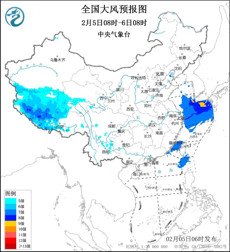 预计,2月5日08时至6日08时,西藏中西部、青海西南部等地将有5~7级、阵风8级的大风;黄海南部海域、东海大部海域、台湾海峡、巴士海峡将有7~8级、阵风9级的大风,其中黄海东南部、东海东北部的部分海域风力可达9级、阵风10级。