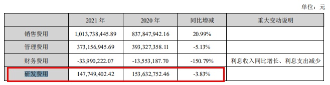 2020年到2022年,东阿阿胶研发投入的费用分别为1.54亿,1.48亿和1.38亿,呈逐年下滑趋势。三年投入的研发费用合计为4.4亿,远低于同期的销售费用。