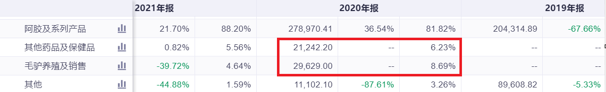 此事之后,其在阿胶市场的市场份额占比明显下降,2020年东阿阿胶市场占比为49%,而福牌阿胶上升至30%。此时东阿阿胶还有大量和主业不相关的业务,阿胶的营收占比已经下降到80%。