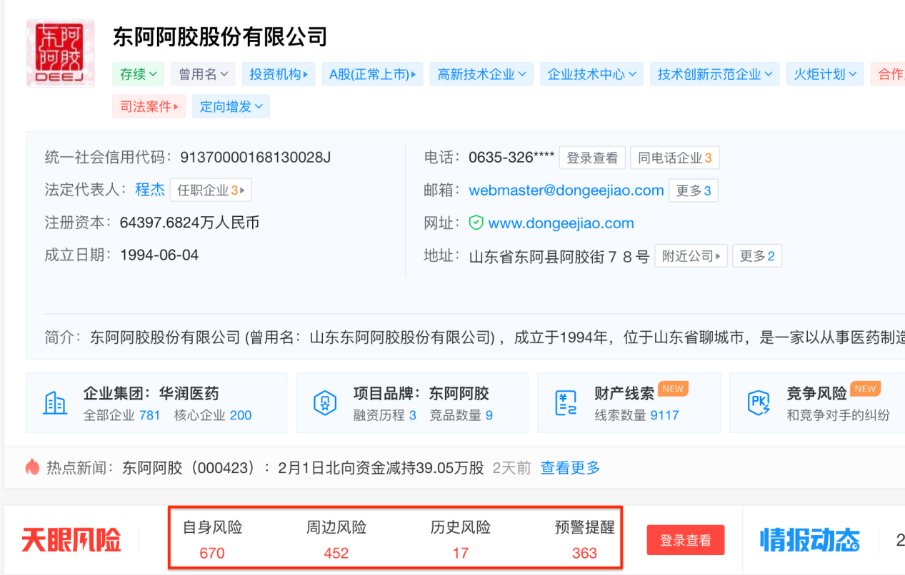 此外,天眼查信息显示,东阿阿胶自身风险和周边风险不少,需要引起公司重视。
