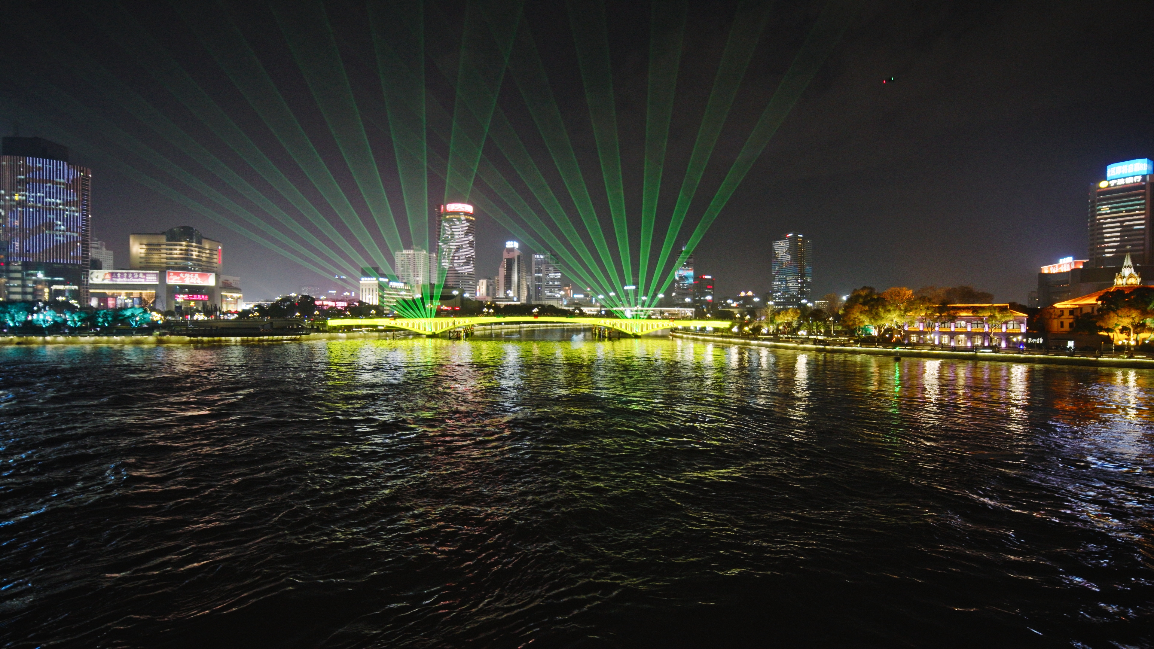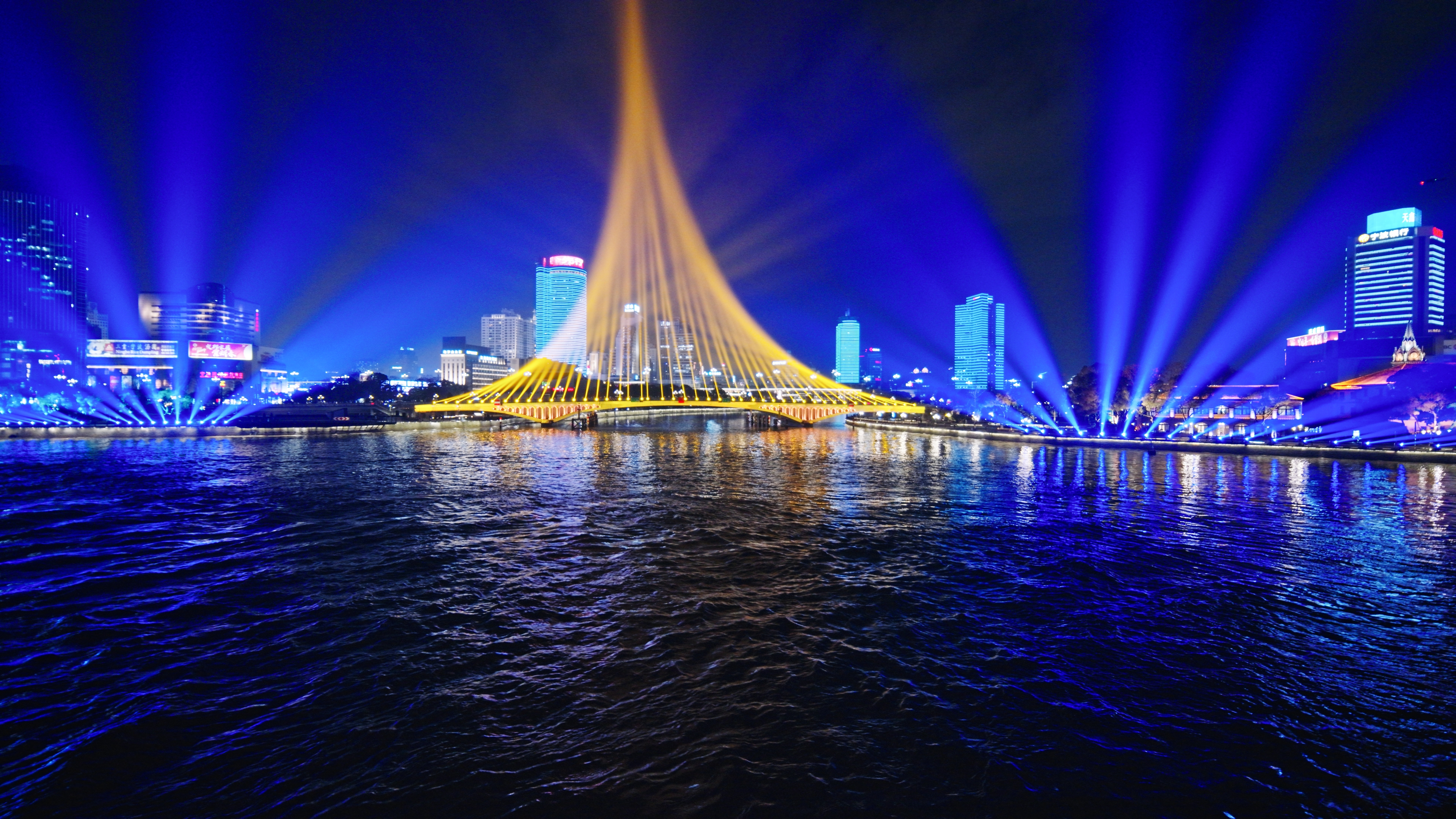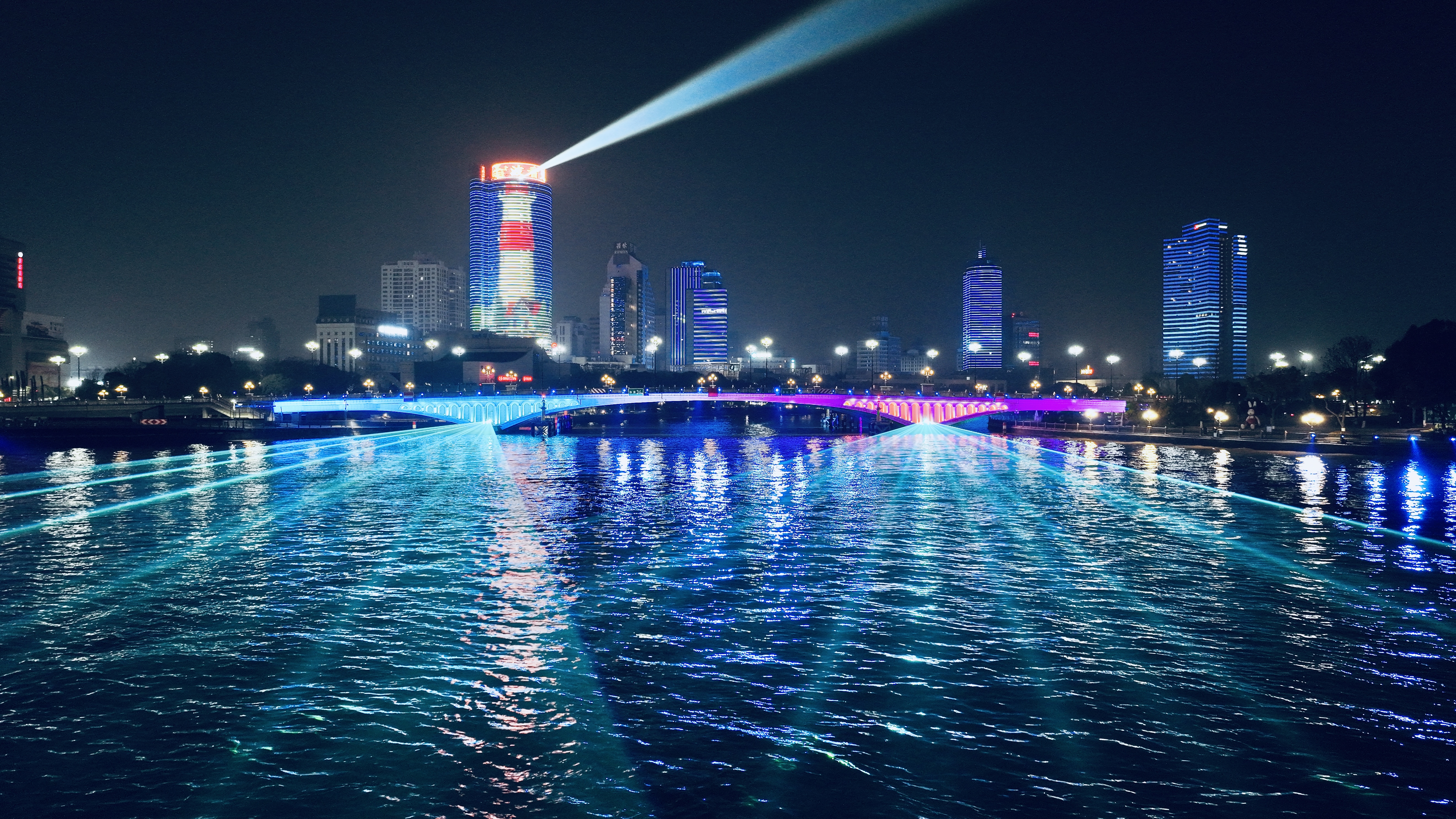 背景音乐声声入耳,新江桥两岸灯光模拟扬帆沧海迎激浪,勇立潮头起新航的景象,意味着城市发展进入现代海洋文明时代。灯光逐浪,勇立潮头,展现宁波帮开疆拓土、敢为人先的城市精神。