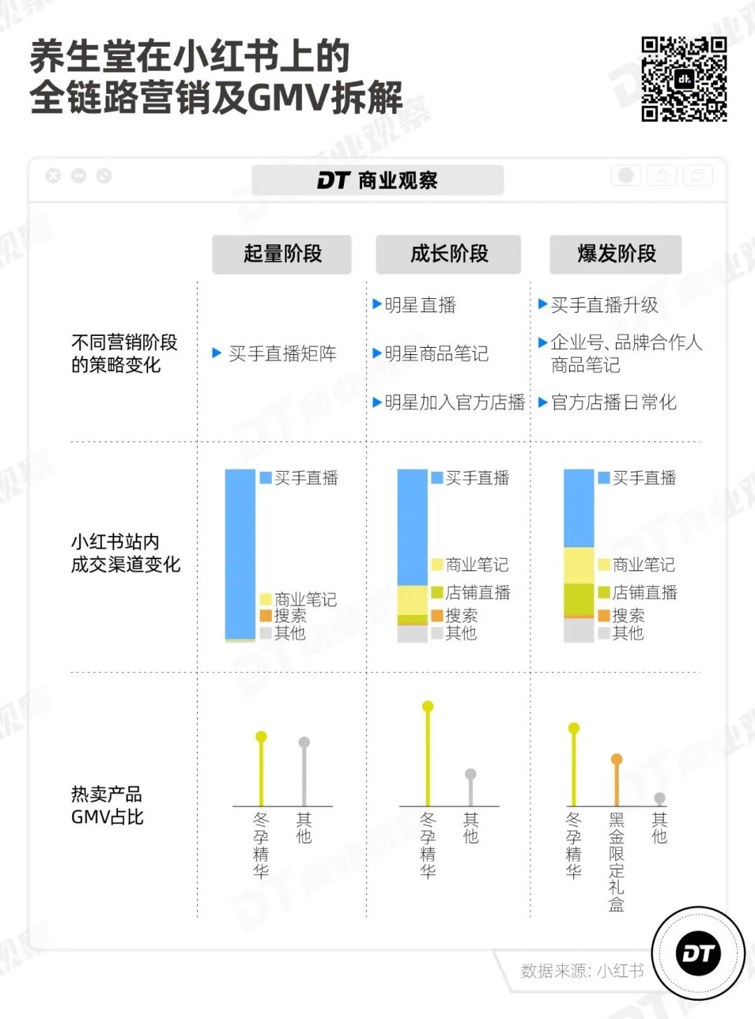 在这一阶段,养生堂在小红书站内的成交场域集中在买手直播,整体GMV起量迅速,冬孕精华的GMV占比超过一半,有不小的起色。