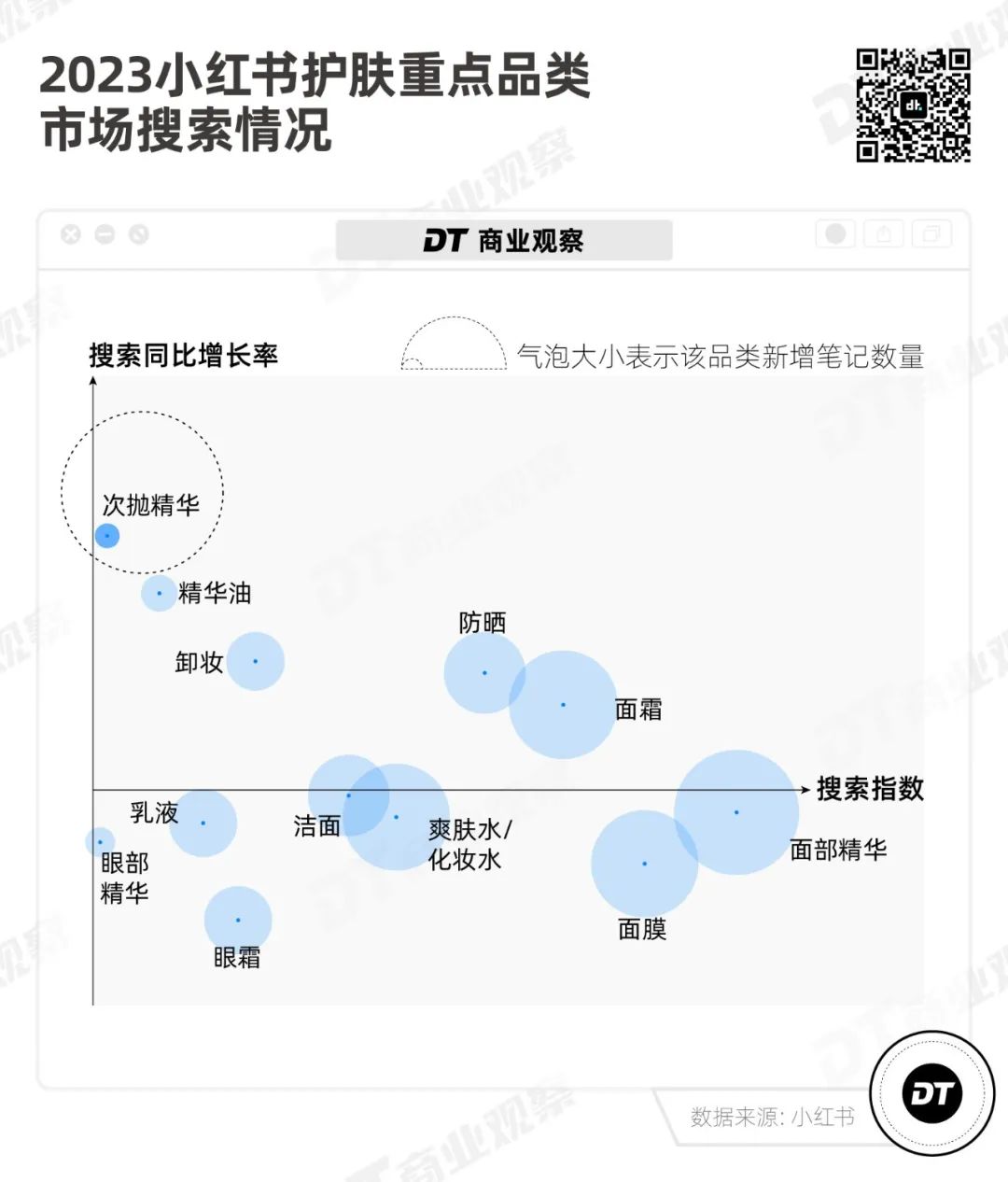 首先,养生堂根据小红书护肤重点品类的搜索情况,选定了次抛精华这一细分品类,推出独立包装的次抛精华,聚焦这个小众、但有爆发潜力的赛道。