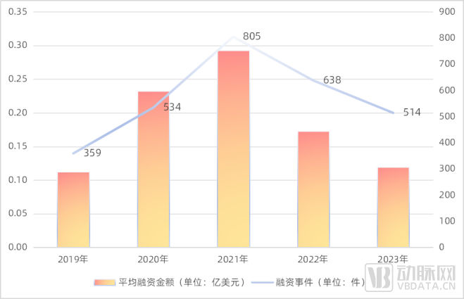 2019-2023年国内生物医药领域平均融资金额与融资事件数历年变化,数据来源:动脉橙产业智库,蛋壳研究院