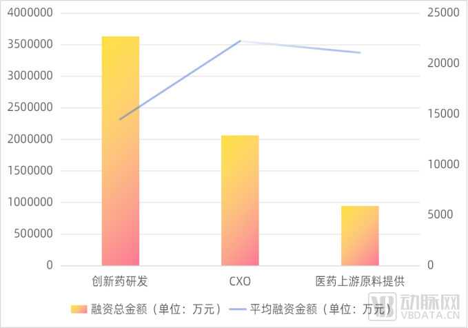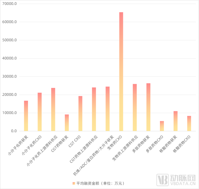从具体细分领域看,小分子化药、大分子生物药、CGT领域的CXO和上游原料供应项目类型平均融资金额均高于创新药研发领域。原因在于,经过近些年的发展,以上大部分领域现有市场竞争格局初步形成,项目偏中后期,融资体量大。