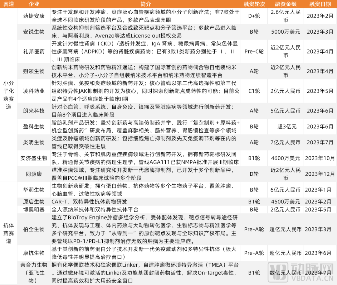 总体来看,2023年在小分子化药和抗体药赛道逆势完成大额融资的项目具有普遍共性,多是具有核心技术平台、产品管线立项足够差异化、临床进度处于市场前列、临床试验稳步推进并具有不错临床数据的企业。
