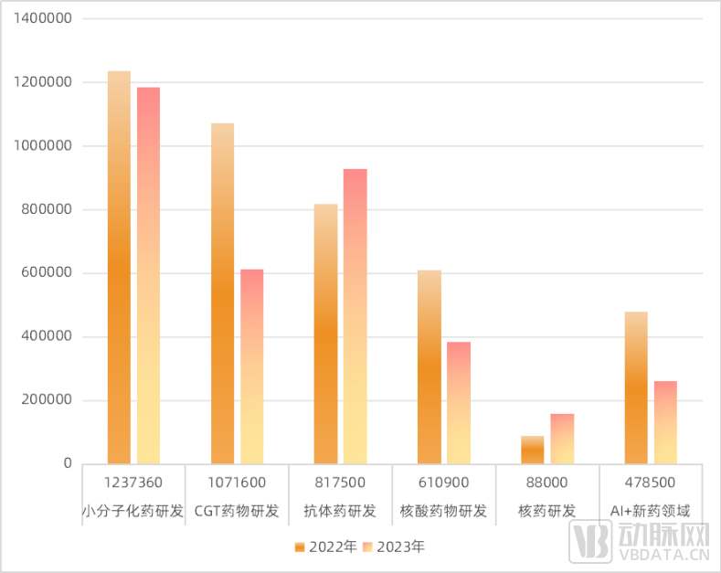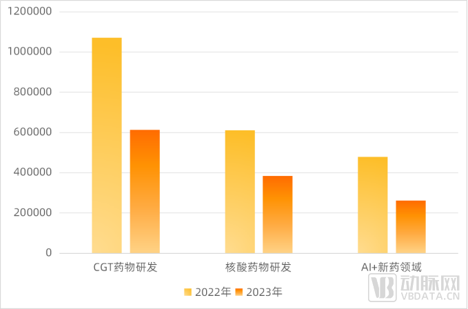 2022、2023年CGT、核酸药物、AI+新药研发投融资情况对比(单位:万元),数据来源:动脉橙产业智库,蛋壳研究院