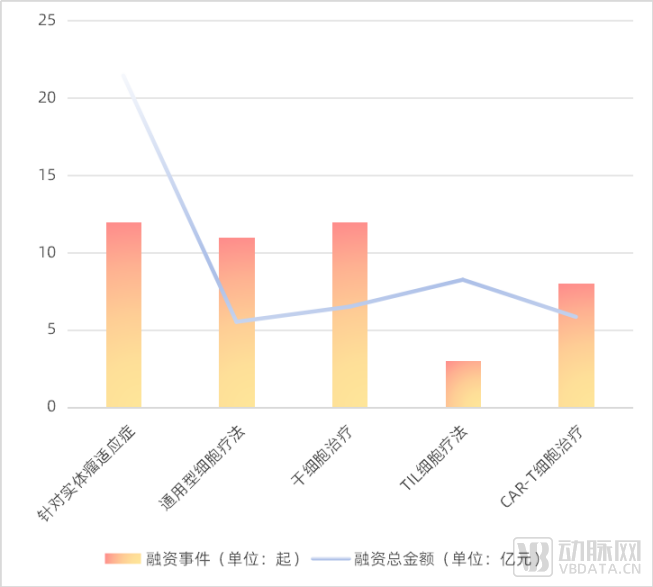 细胞治疗药物研发领域融资排名前20%的项目9起涉及实体瘤或通用型,2起干细胞相关。