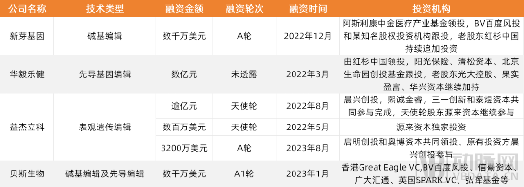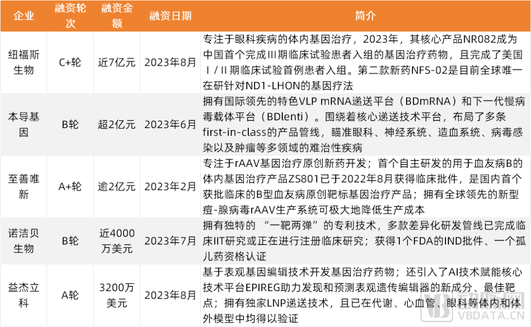 其中贝斯生物、益杰立科两家企业基于前沿的碱基编辑/表观遗传编辑技术路线进行基因药物开发的初创企业值得关注,分别在2023年获得数干万美元和3200万美元大额融资。
