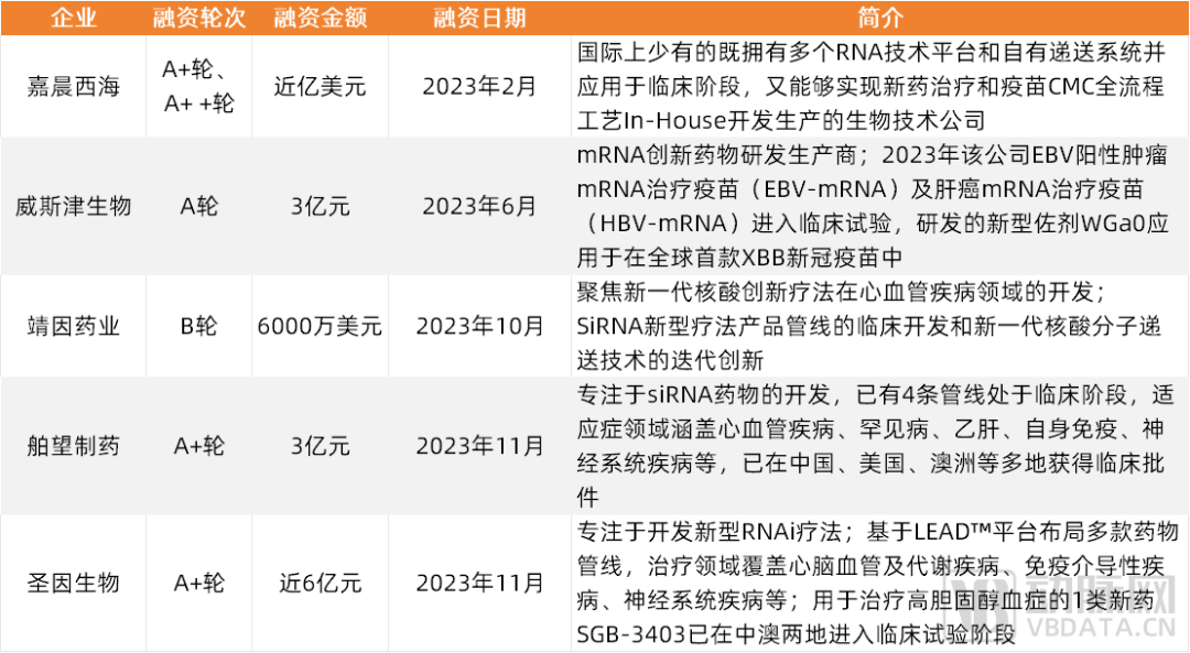 2023年核酸药物研发领域投融资TOP5有3家均为研发小核酸药物的企业。其共性在于团队稀缺、技术积累深厚、具有自主知识产权的递送技术平台、管线推进迅速。