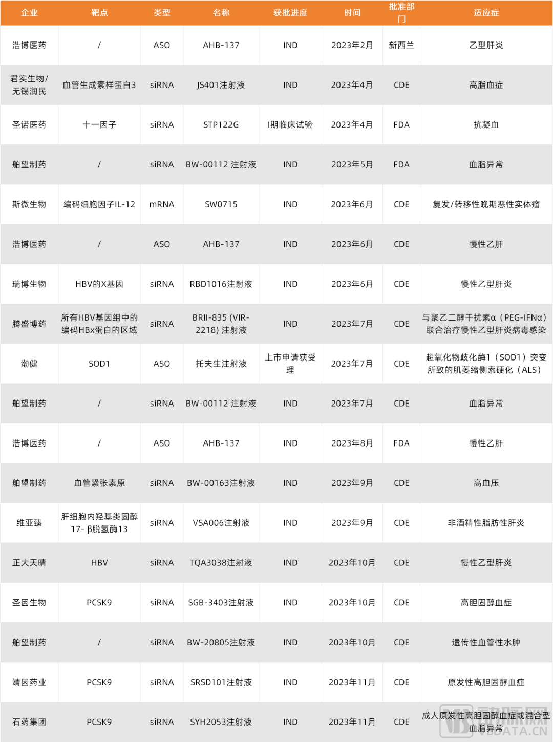 2023年中国小核酸管线IND获批情况,数据来源:各企业公开报道,蛋壳研究院整理