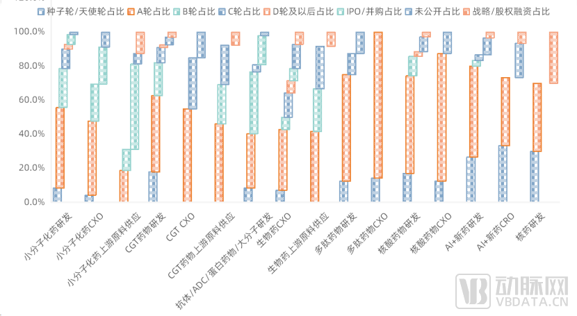 2023年创新药及供应链领域各细分赛道融资事件融资轮次分布,数据来源:动脉橙产业智库,蛋壳研究院