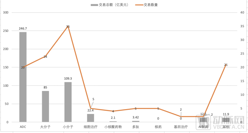 对2023年中国药企BD交易的药物类型进行分析,ADC、大分子药物、小分子药物是BD交易市场的主要阵地。其中,ADC领域以交易金额的绝对优势成为2023年的最热门领域。2023年ADC领域共达成20件BD交易,金额高达246.7亿美元。其中,License out事件共14件。