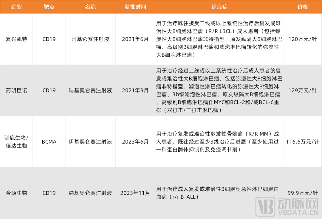 目前国内获批上市的CAR-T产品概况,数据来源:公开资料整理,蛋壳研究院