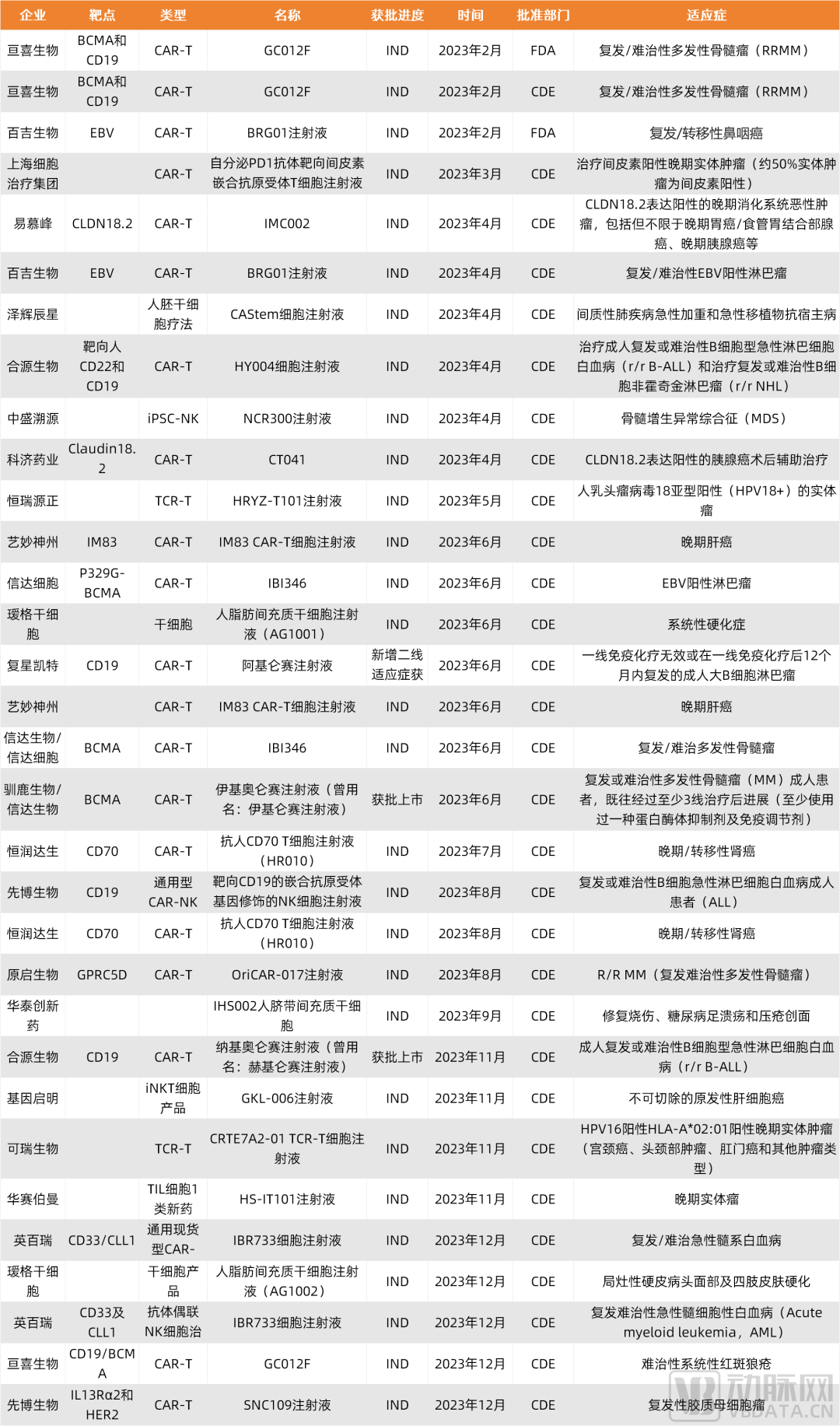 2023年国内细胞治疗管线IND获批情况梳理,数据来源:公开新闻汇总整理,蛋壳研究院