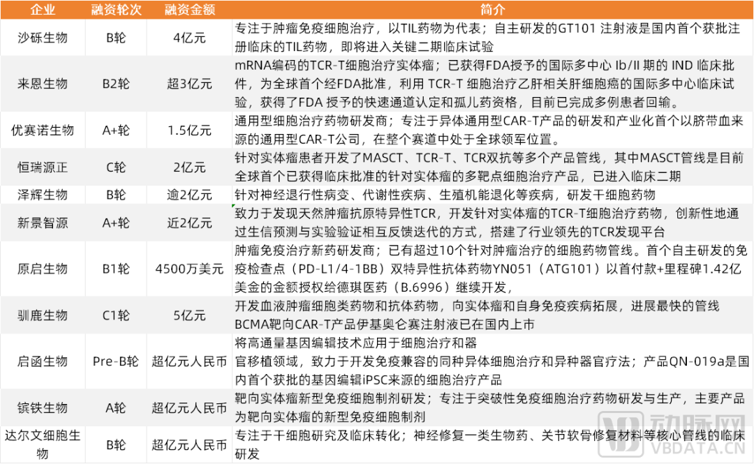 其中,华赛伯曼、原启生物、沙砾生物3家开发TIL细胞治疗药物的企业共获得8.24亿元融资;包括驯鹿生物、来恩生物、恒瑞源正、新景智源等在内的12家瞄准实体瘤适应症的细胞治疗药物研发企业获得21.44亿元融资。