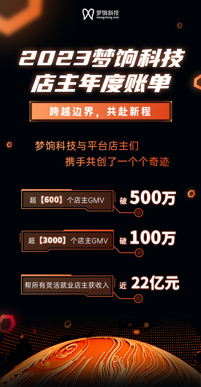 2023年4月,梦饷科技“梦饷新征程”战略发布会宣布全面开放开源,形成个体店主、企业级店主、团长、主播等不同类型的流量合作伙伴汇聚、合力的格局。据梦饷科技2023店主年度账单显示,新战略下,梦饷科技全年新增各类型店主超80万人,触达到超1000万个新消费者;超600个店主销售额破500万元,超3000个店主销售额破100万元。
