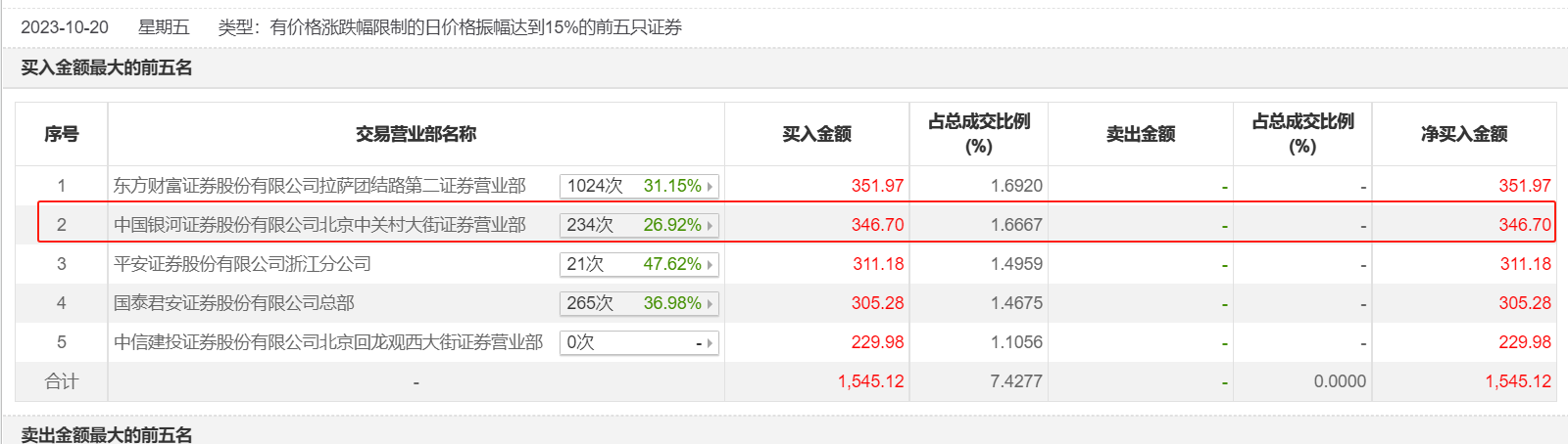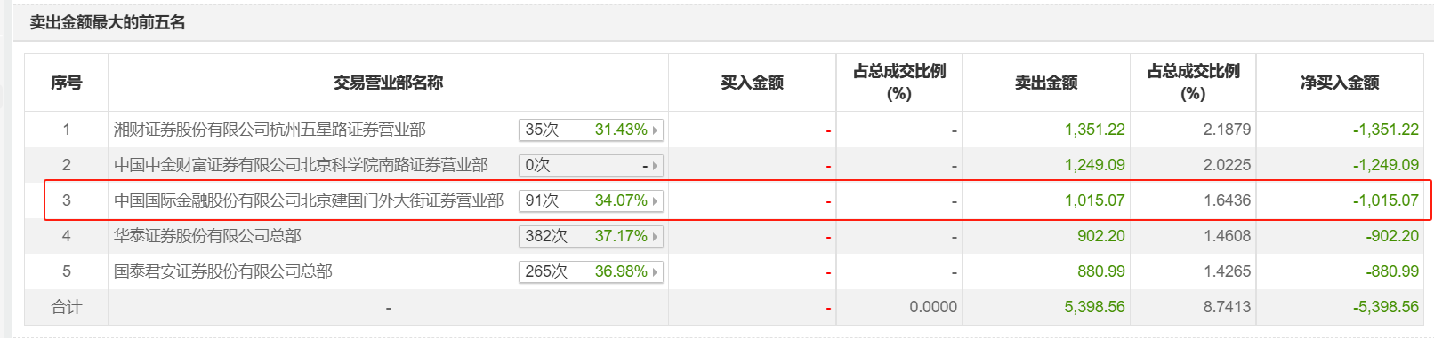 比如,中金公司北京建国门外大街营业部在“交易异动成交营业部榜单”上屡次出没。该营业部在2023年10月20日卖出238万元,2024年1月23日卖出1015.07万元,1月25日卖出2189.62万元,同时买入924.13万元。