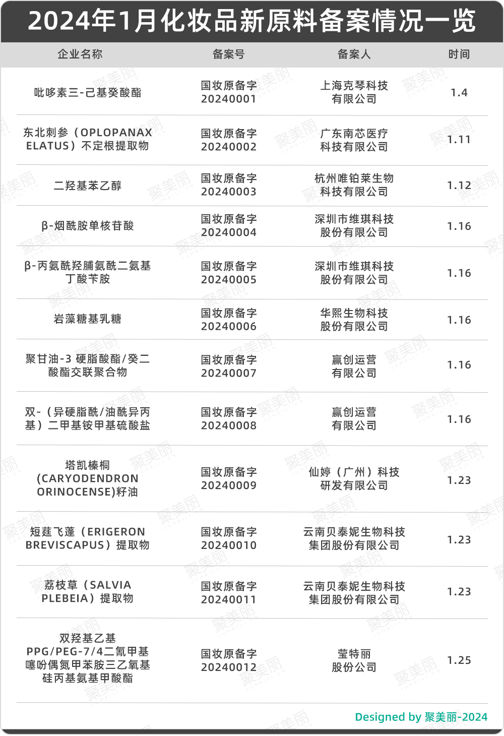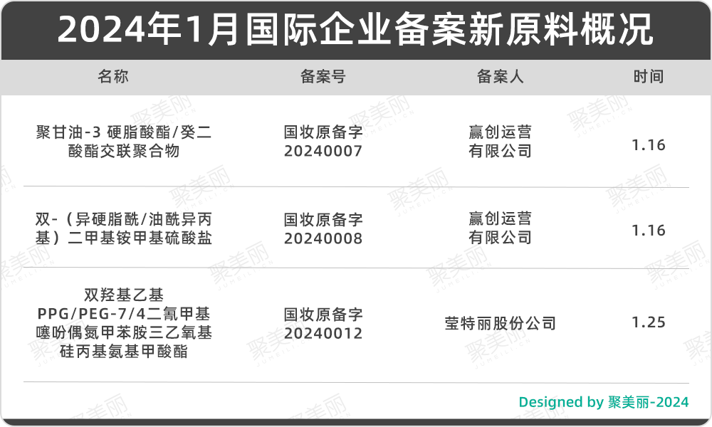 从上文来看,今年1月原料备案提速,数量同比大幅提升;国产原料占比75%;国际企业相继布局中国市场,在华备案新原料;本土美妆品牌企业持续加码原料赛道;植物原料仍是“热门”,占本月原料备案的1/3。