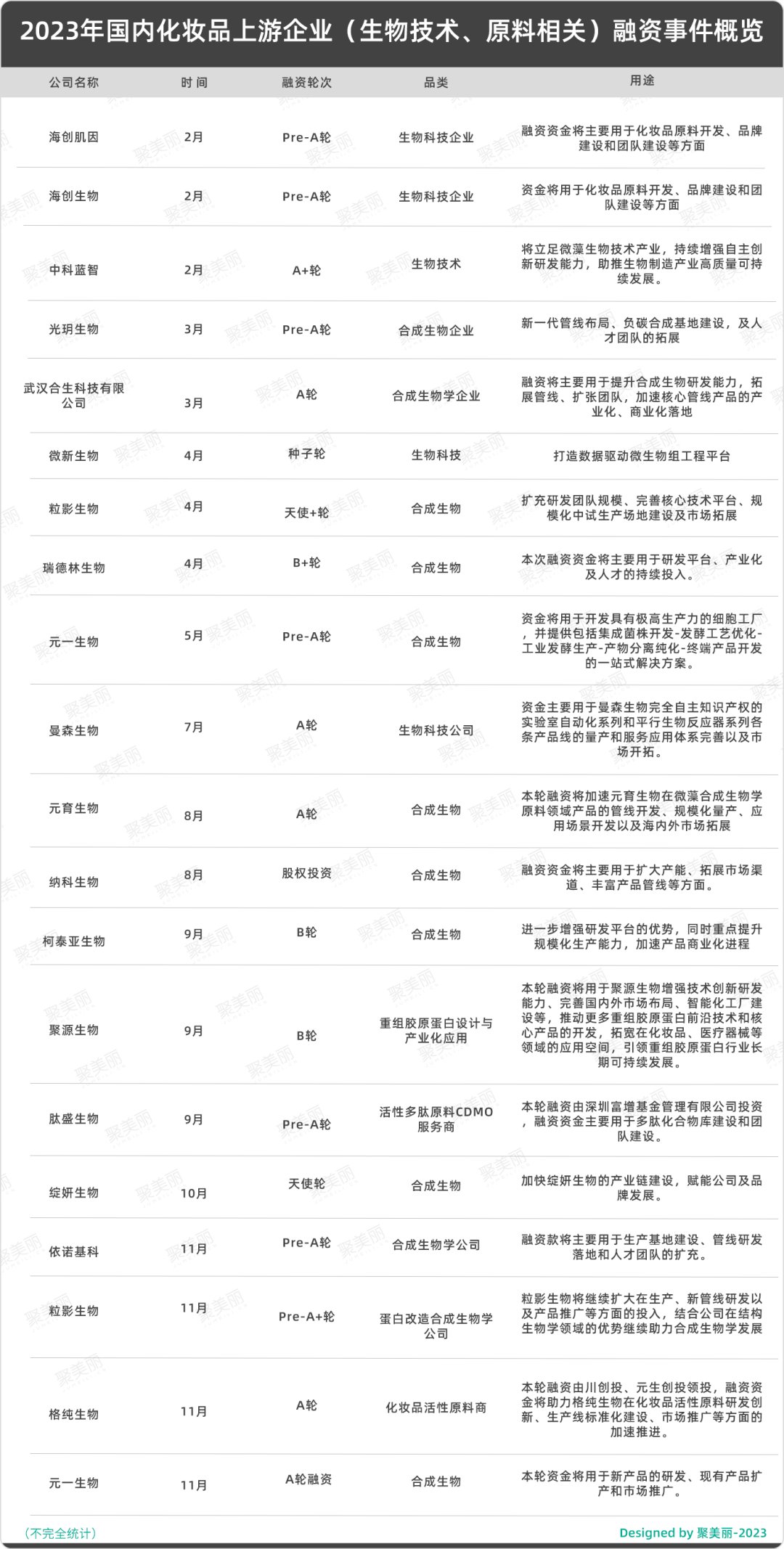 “卷”原料,也会倒逼企业提升科学技术,推动行业正向发展。这一点从资本市场的动向也能窥见。我们发现,即便是在投融资趋于冷静的2023年,市场上仍有不少原料技术相关的融资事件。据聚美丽不完全统计,2023年在原料技术相关的融资至少20起,而这也从侧面反应出资本市场对于上游原料的看好。