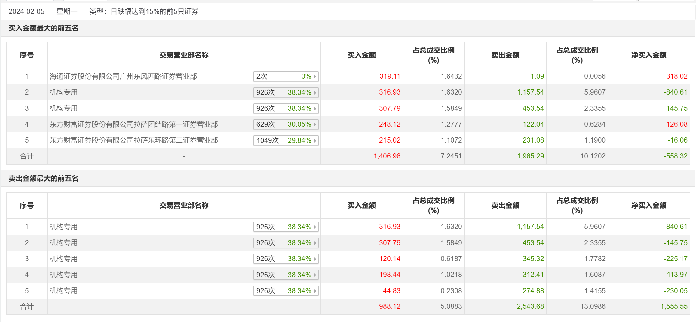 2月5日,中科磁业今日跌停,全天换手率达25.66%,振幅达18.05%。龙虎榜数据显示,营业部席位合计净卖出1127.51万元。其中,机构买入988.12万元,卖出2543.68万元,合计净卖出1555.55万元。此外,东方财富证券拉萨东环路第二证券营业部、东方财富证券拉萨团结路第一证券营业部分别卖出231.08万元、122.04万元;海通证券广州东风西路证券营业部、东方财富证券拉萨团结路第一证券营业部分别买入319.11万元、248.12万元。