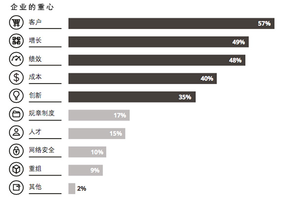 CIO的影响力在很大程度上是他们所创造的商业价值累积的结果。然而随着企业需求的不断变化,CIO需依靠经验针对企业重心和期望作出应对调整。德勤调研显示,客户、增长、绩效、成本和创新是CIO们公认的五大企业重心。