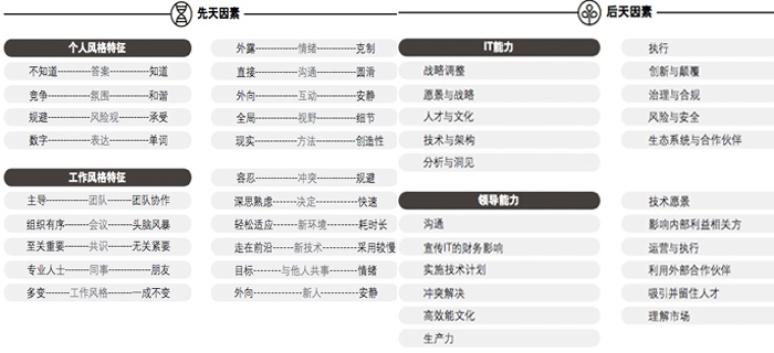 为了研究先天因素,德勤罗列出二十种个性特征:比如CIO如何做决策,如何与他人共事,如何承受风险,这让我们能够准确看出CIO在影响力模式上的不同之处。为了研究后天因素,德勤重点关注十项IT能力以及十二项领导能力,比如阐述技术愿景及策略的能力,吸引和留住人才的能力,打造高效文化能力。