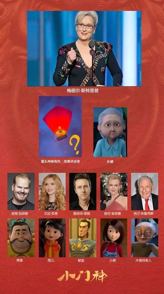 梅姨将在国际版《小门神》中出演旁白一角,并且为女主角外婆配音。除了以上三位,喜剧明星吉姆·加菲根、影视新星贝拉·索恩(《惊声尖叫》)、迈克·比尔比利亚(《女子监狱》)以及兰道尔·朴(《采访》)均会为影片献声。