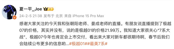 2月5日晚,集度CEO、极越CEO夏一平在微博发文称,今天直播中未提及极越07价格,说的是极越01的价格21.99万。夏一平表示,极越07今年肯定会上市交付,春节后会陆续公布更多信息。