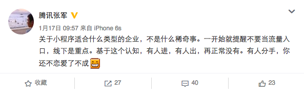 相比于“小程序”长达一年的造势渲染,从应用号过渡到小程序、又在去年9月25开启内测邀请,12月底为2017年1月9日的“发布会”预热,张小龙的准备不可因为不充分,自媒体人的自来水不可谓不汹涌,但就在所有人都等着看小程序一展宏图的时候,不到2天,小程序就跌落神坛。