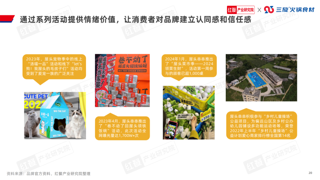 此外,还有品牌通过系列营销活动提供情绪价值,让消费者对品牌建立认同感和信任感。以屋头串串为例,屋头串串瞄准了“宠物经济”下的年轻群体,推出了屋头宠物季系列相关活动,与爱宠一族建立亲密联系,提高品牌亲和力。