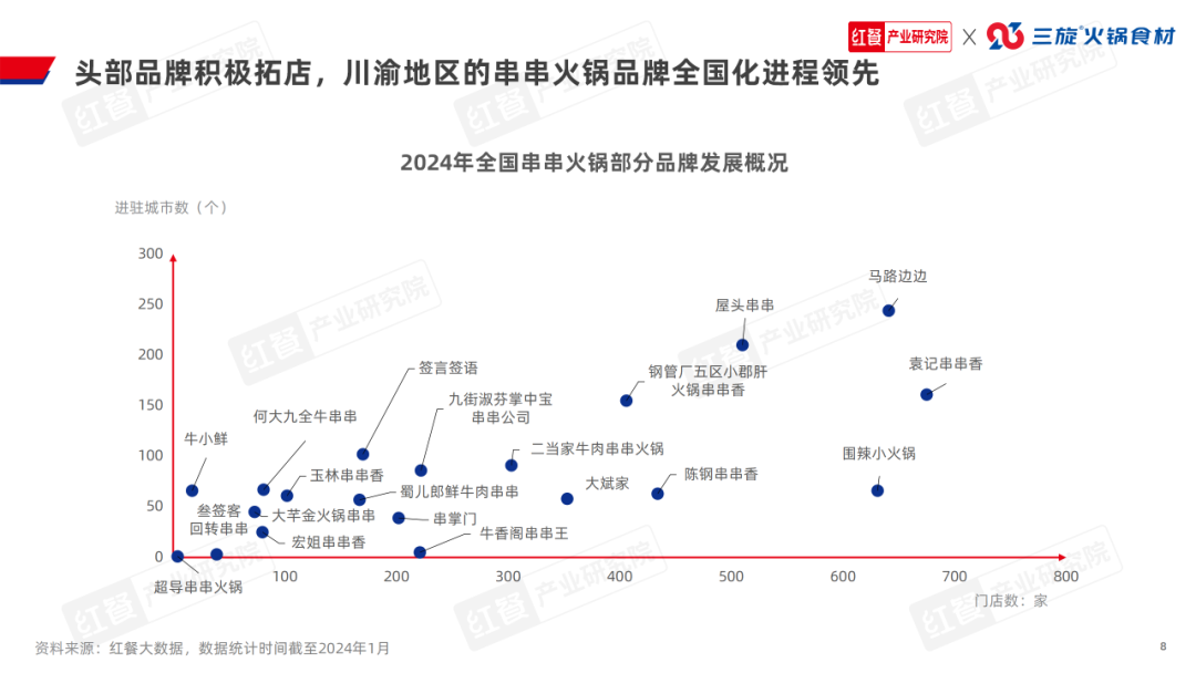 红餐大数据显示,截至2024年1月,门店数在100家以上的串串火锅品牌数占12.6%,门店数在51~100家的串串火锅品牌数仅占7.4%。门店数在50家及以下的串串火锅品牌数占比达八成,整个赛道的品牌规模化程度有待提升。
