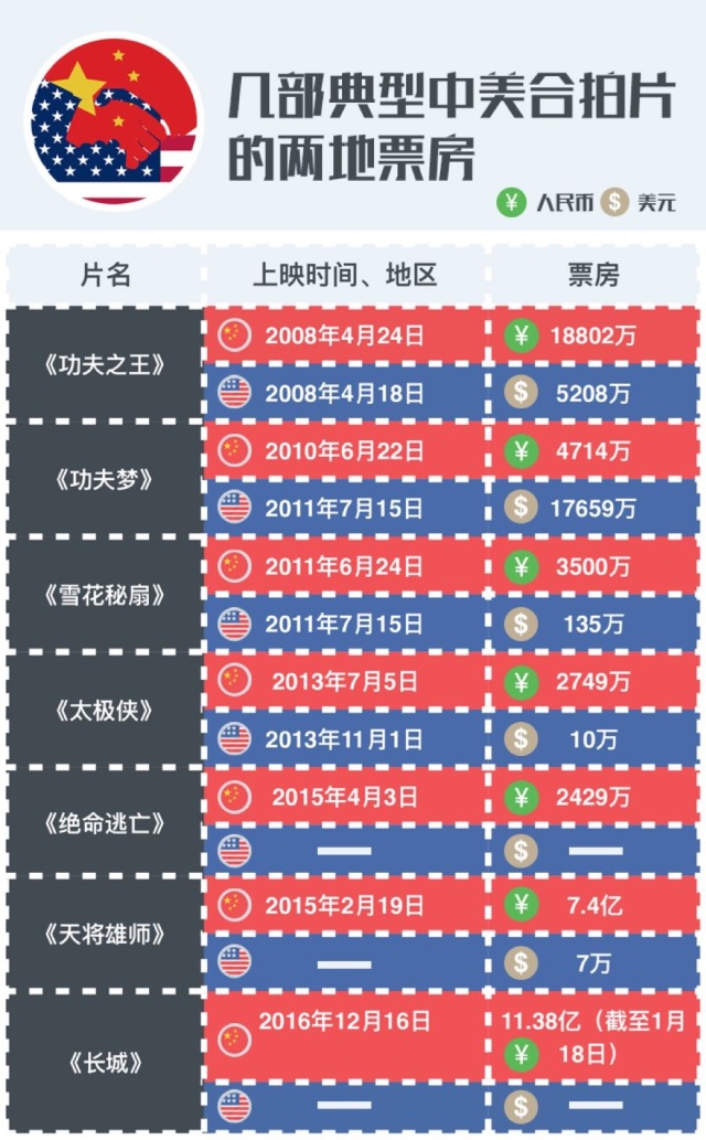 2016年12月16日,电影《长城》顶着史上最大“中美合拍”光环上映,这部电影投资1.5亿美元,由传奇影业、环球影业、中影集团以及乐视影业联合投资,成为中美电影合作的一块超大型试验田,这无疑又点燃了业内关于合拍模式的美好期望。