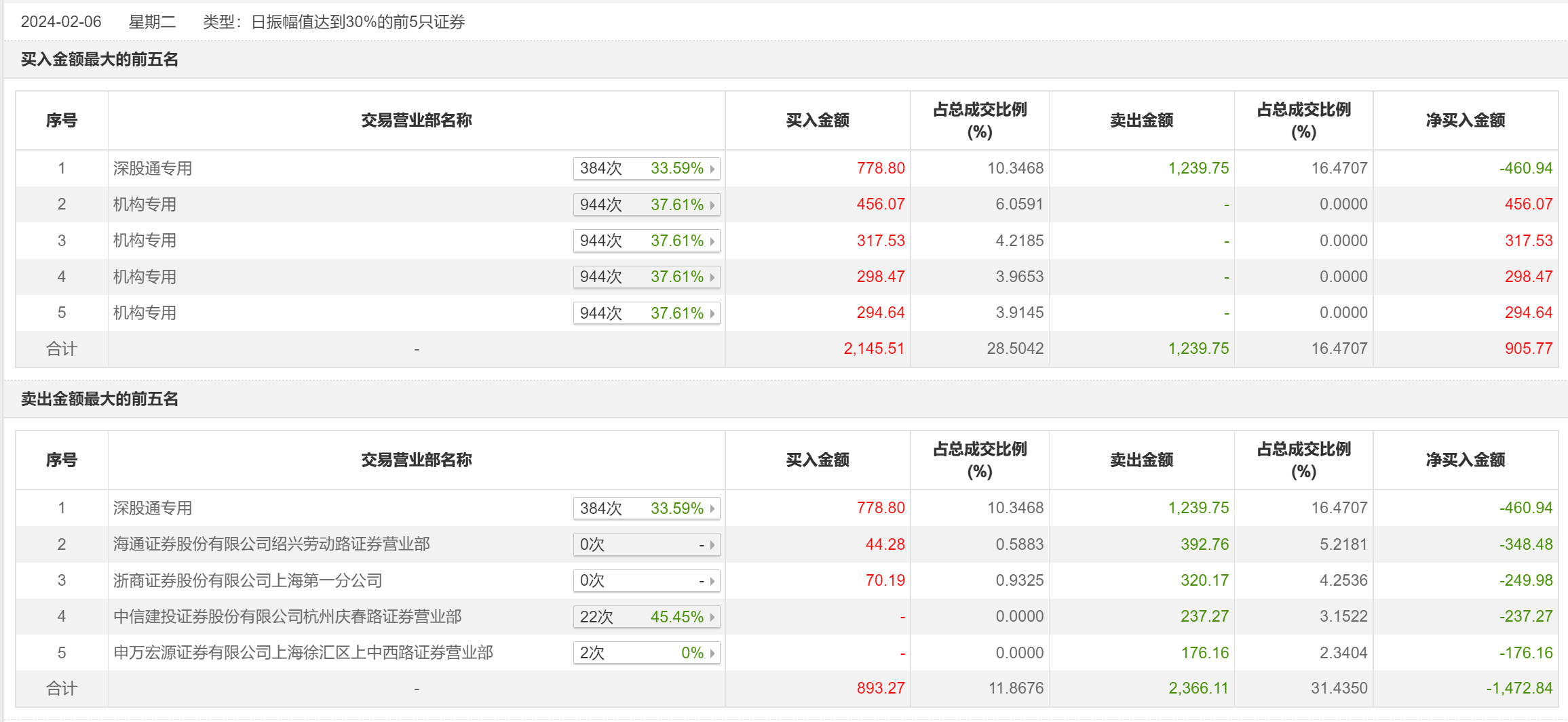 2月6日,米奥会展今日涨13.81%,全天换手率达2.62%,振幅达30.87%。龙虎榜数据显示,营业部席位合计净卖出106.12万元。其中,机构合计净买入1366.71万元。此外,深股通专用、浙商证券上海第一分公司分别买入778.80万元、70.19万元;深股通专用、海通证券绍兴劳动路证券营业部分别卖出1239.75万元、392.76万元。