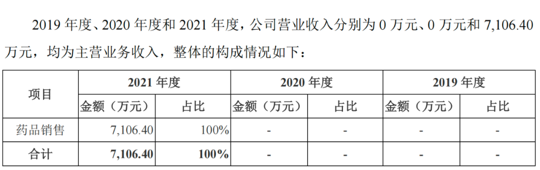 华昊中天科创板招股书显示,2019年和2020年,公司没有产品上市销售,因此尚未实现营业收入。直到2021年,华昊中天才通过销售药品获得营业收入7106.40万元,而这些收入全部来源于优替德隆注射液。