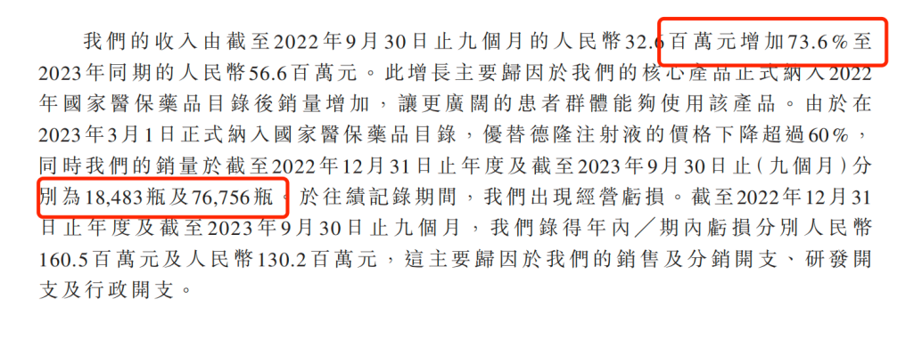 值得一提的是,截至2023年9月末,公司的收入较2022年同期增长了73.6%,其增长的原因,主要是因为核心产品优替德隆注射液于2023年3月1日正式纳入国家医保药品目录,因此销量增加。截至2022年和2023年9月末,优替德隆注射液销量分别为18483瓶和76756瓶,销量出现大幅增长。