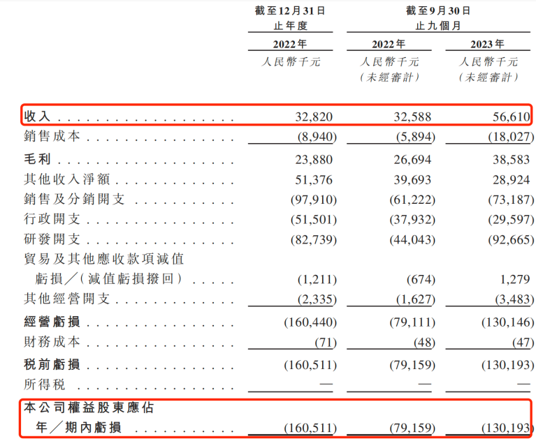 此次申报港股上市,华昊中天仍没有摆脱亏损的现状。2022年和2023年9月末,公司的营业收入分别为3282万元、5661万元,同期净利润分别为-1.61亿元、-1.3亿元。