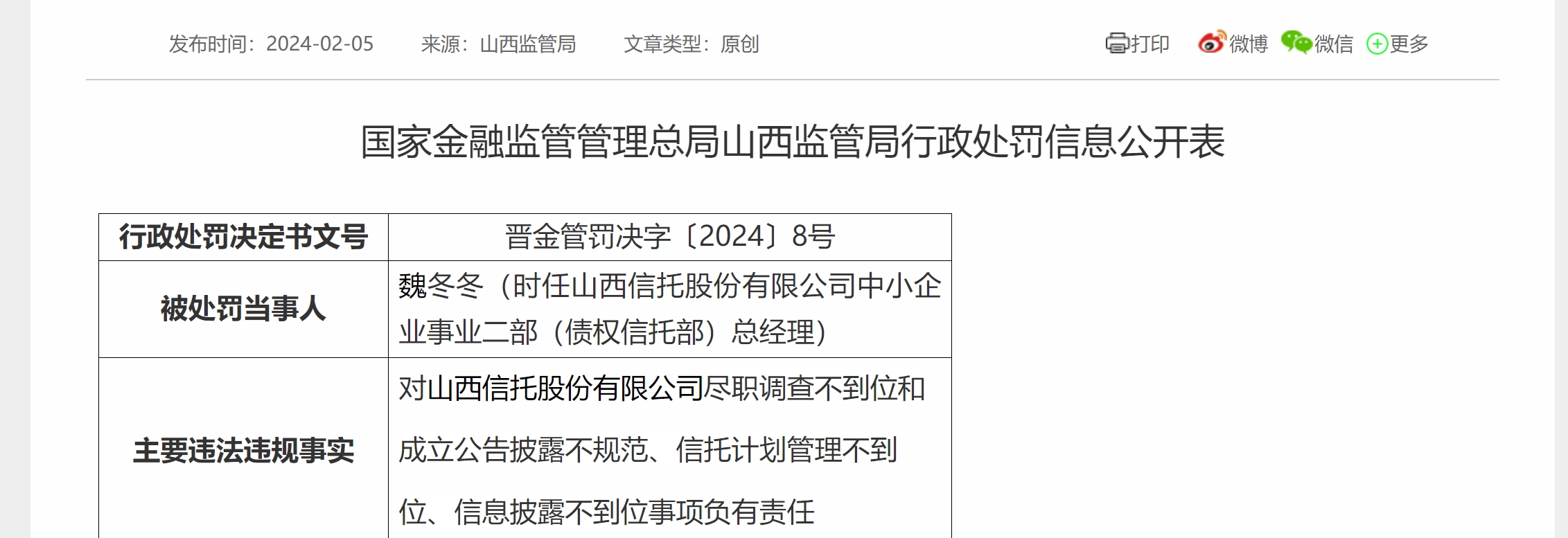 2月5日,国家金融监督管理总局消息,时任山西信托中小企业事业二部(债权信托部)总经理——魏冬冬被国家金融监督管理总局山西监管局开出警告的行政处罚决定。