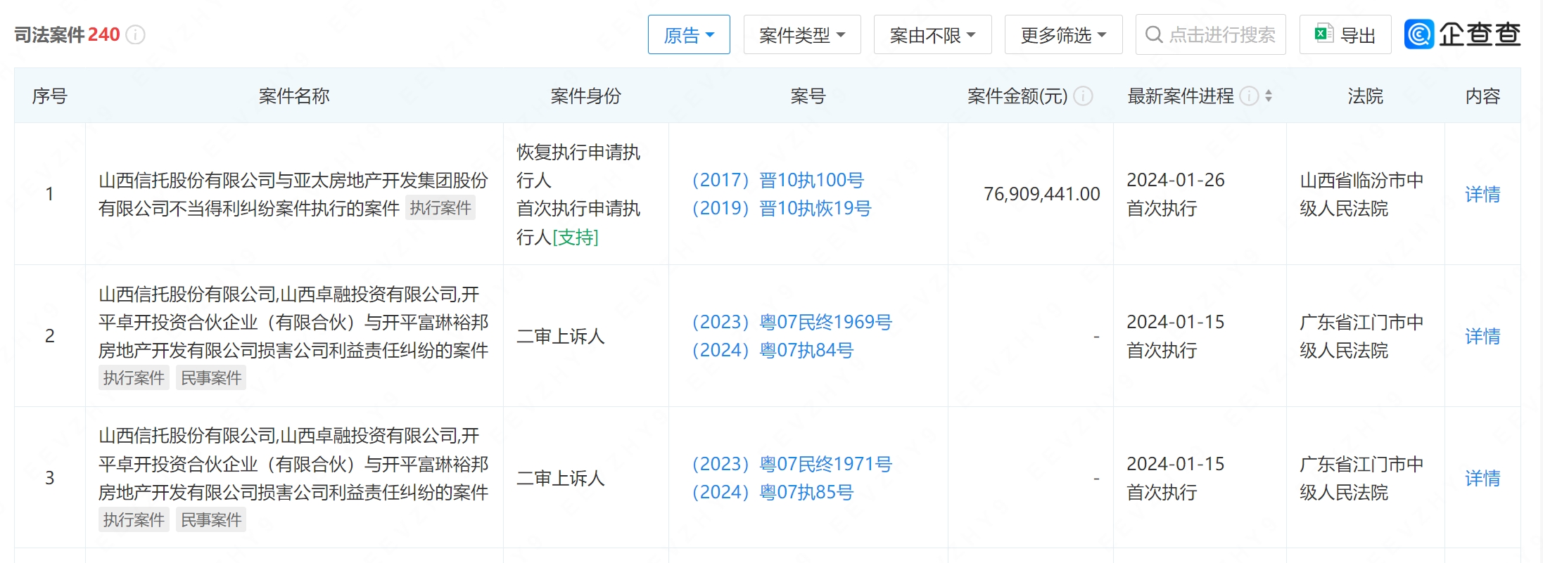 企查查显示,截至目前,山西信托仍有不少涉房信托诉讼正在进行中。