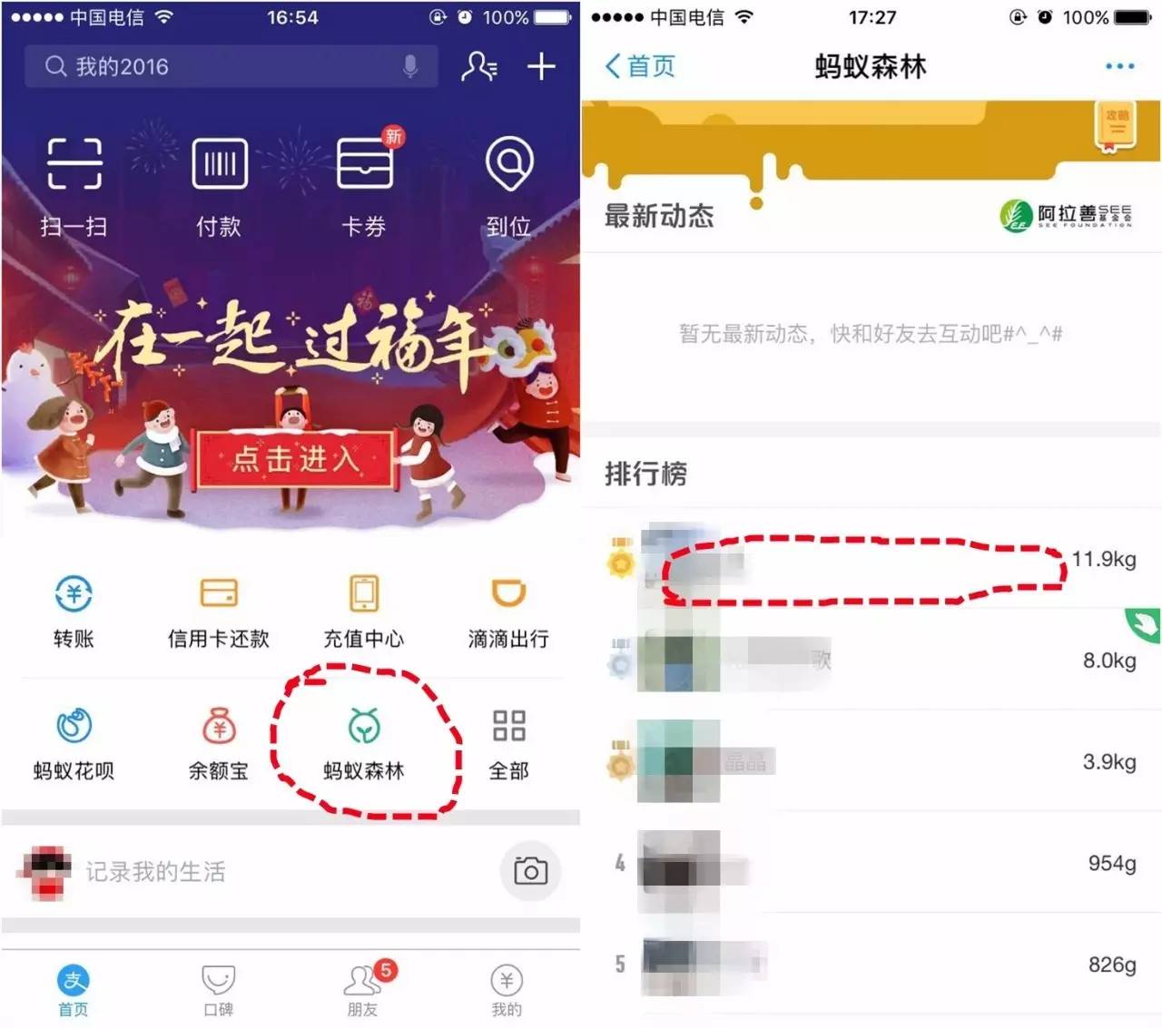 第二种“除了扫一扫”外的获得福卡的方式,是开通支付宝APP里的“蚂蚁森林”服务,通过“给好友浇水”的方式收集福卡(此方法1月20日才会开启)。