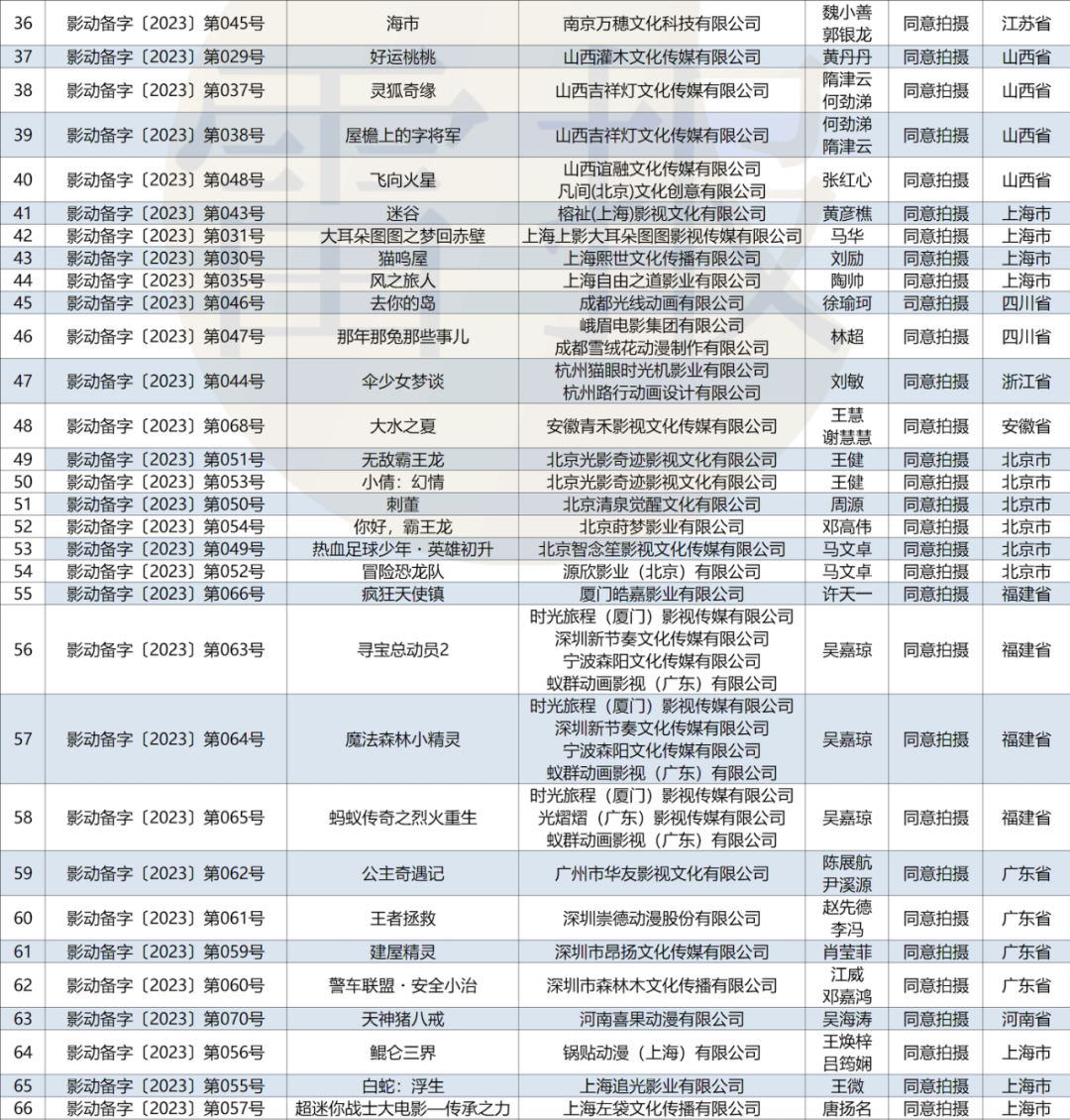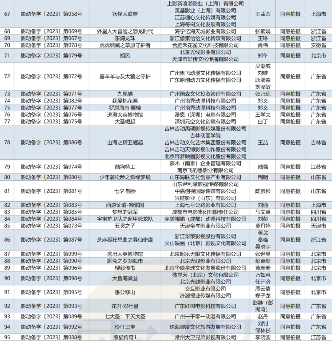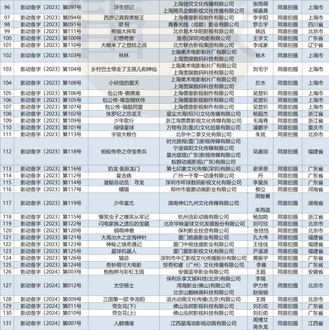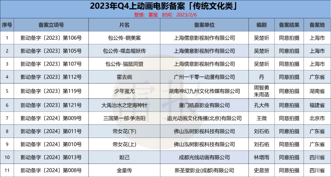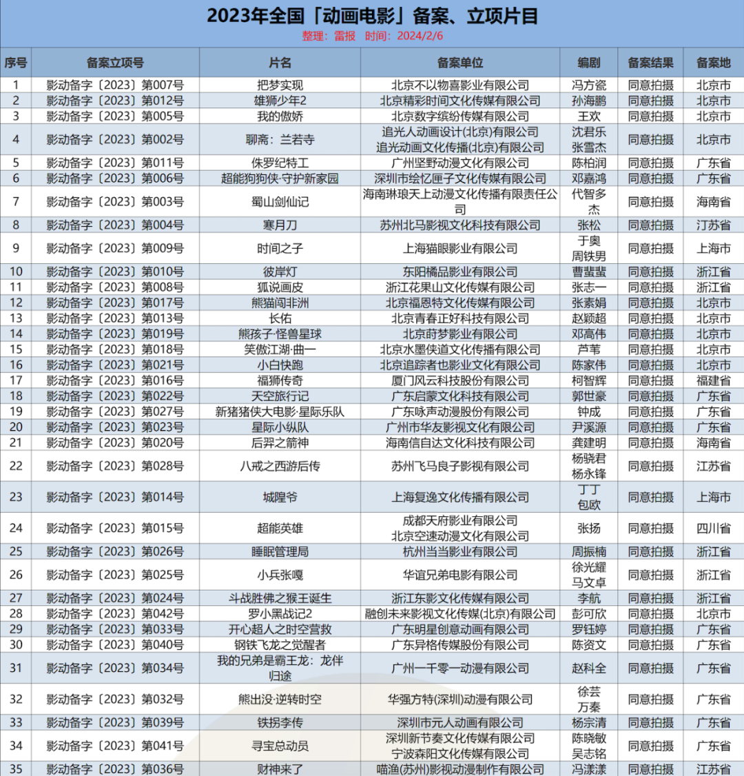 雷报也曾在2023年年内报道过Q1-Q2以及Q3的动画电影备案立项情况。1月30日,国家电影局发布了“关于2023年12月下全国电影剧本(梗概)备案、立项公示的通知”。至此,2023年电影备案立项片目已全部公布。