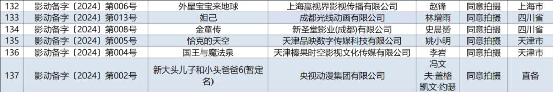 其他的影视公司“熟面孔”也有不少。儒意影视备案了4部作品,分别为《西游记真假美猴王》《包公传-铡美案》《包公传-喋血帽妖传》《包公传-猫鼠同盟》;华映星球备案了2部作品,分别为《柳毅传书》《闪电家族之遗忘的宝藏》;企鹅影视备案了1部《浮生丽记》;华策影视备案了1部《芝麻狐狂想曲之寻仙奇缘》;新圣堂备案了1部《金童传》。完美世界控股的公司完美鲲鹏在2023年备案了1部《宇宙护卫队之超甲恐龙队》。