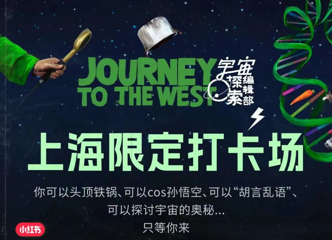 而小红书利用自己对流行文化的前瞻能力,的确可以帮助一部分影视作品打造出圈热点,潮上加潮。比如《宇宙探索编辑部》中孙一通的“锅盖头”,在小红书意外走红。于是小红书联合片方在上海举办了《宇宙探索编辑部》限定打卡场,当中就有电影道具展出,满足用户线下打卡的心愿。